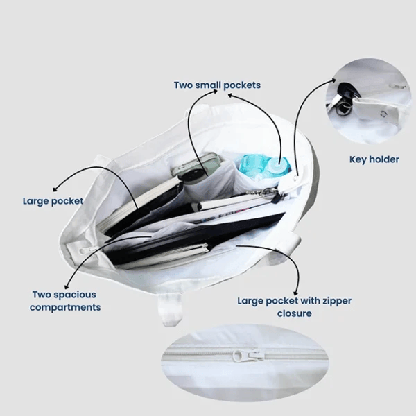 This tote is thoughtfully designed with two spacious inner compartments for easy separation of essentials. It features a large inner pocket, two small pockets, and one zippered pocket for secure storage. The dedicated water bottle holder keeps drinks upright, while a built-in key holder helps you avoid unnecessary searching. With these compartments, organizing your daily must-haves becomes effortless.