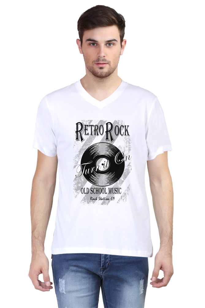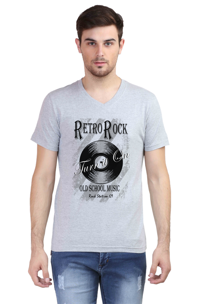 Rock Station 69 – Retro Rock – V Neck T-Shirt – White | Grey Melange