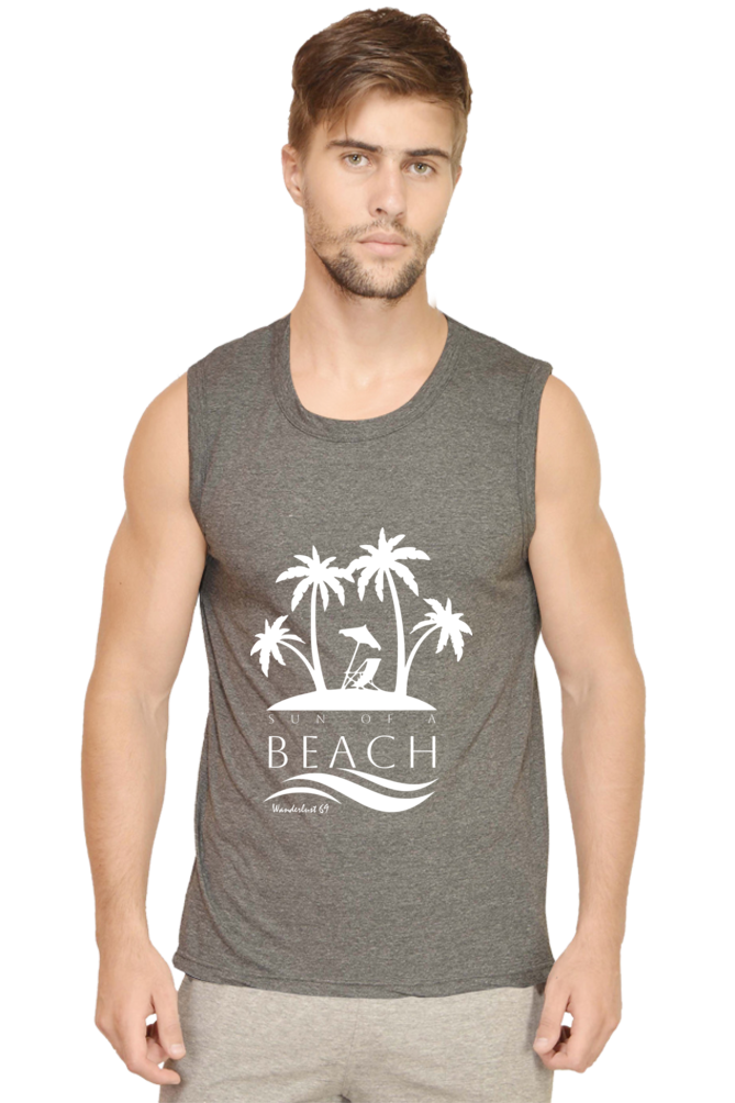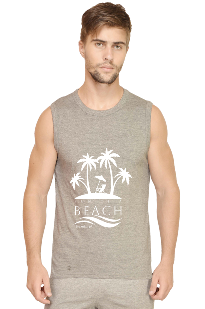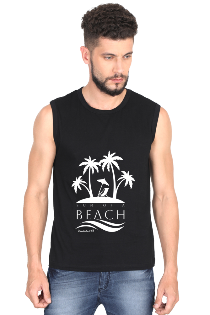 VIBE 69 SLEEVELESS T-SHIRT – WANDERLUST 69 – SUN OF A BEACH: 180 GSM 100% Super Combed Cotton | Soft, Breathable Feel | Lightweight & Airy Construction | Bio-Washed for Smooth Texture|  Pre-Shrunk | Double Stitched | Folded Neck | FIT: Regular Fit. Not Too Tight. Not Too Loose | SHIPPING & DELIVERY: Free Shipping with no minimums. Typically delivered within 4-6 days from the order date.